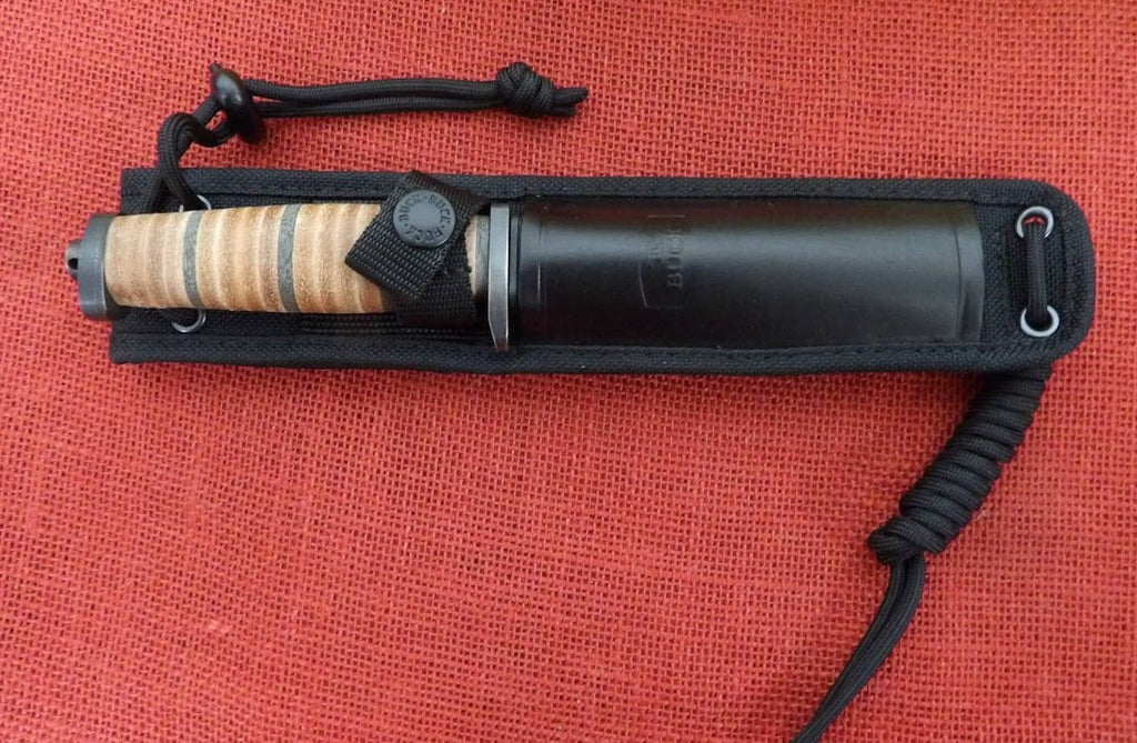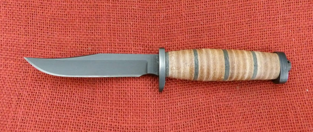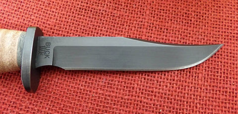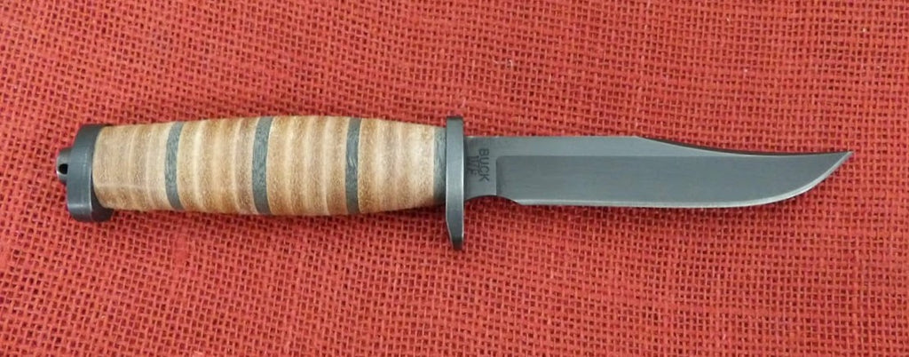 It new Brahma is a fresh new twist on the classic Buck 0119 but features a classic leather and micarta stacked handle and a tactically finished black blade. This model features a brown leather handle complete with black micarta spacers, a clip point style blade in a black oxide finish and the MOLLE compatible black leather and nylon sheath provides a button-clasp security strap and secondary closing tie. Made in the USA.