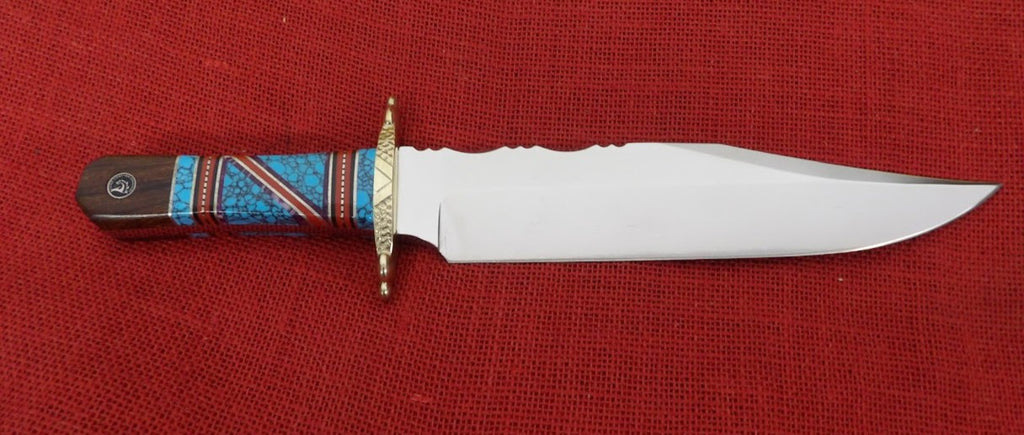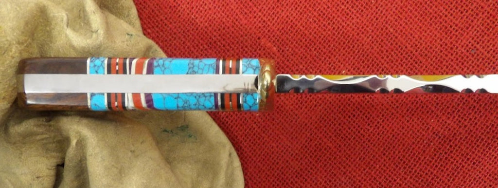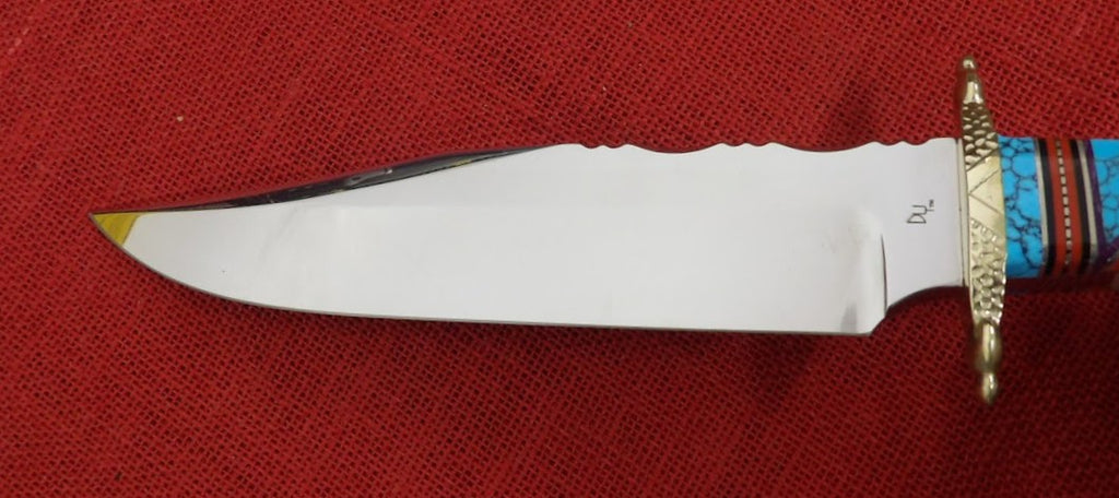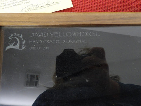 David Yellowhorse, Navajo, Limited Edition of 200, the 9 3/8" blade is marked with the makers "DY" logo, the other side of the blade has the makers signature, horse head and #146, a nickel silver guard, the left handle embellished with inset turquoise, coral, silver, an eagle and feather, the right handle with similar stone inlay and a horsehead within a circular inlay marked "Hand Crafted Original", the knife overall 14", housed in a wood display case with "DY" horsehead medallion. Dimensions of the display case with knife approx. 2.25"h,16.75"w, 6.5"d, total of all 4.85lbs