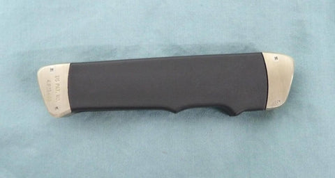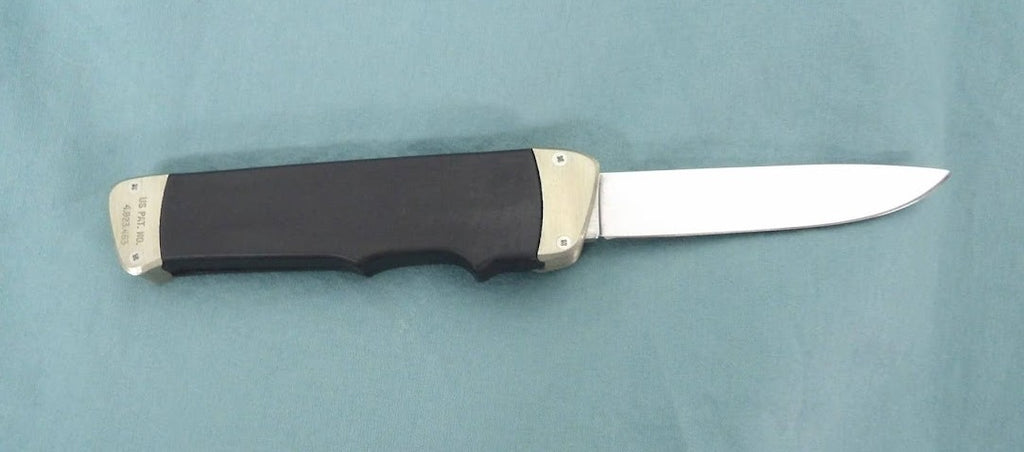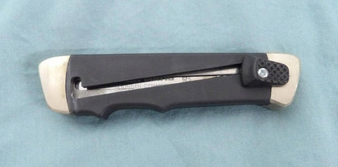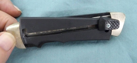 Black delrin handle-you split the handle and then push the blade out. Split the handle again and the blade retracts.
