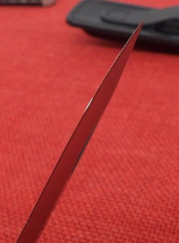 It has the factory edge but there is one small spot on the blade. I took a pic-you can see the shiny spot. Looks like it hit something-maybe got dropped.