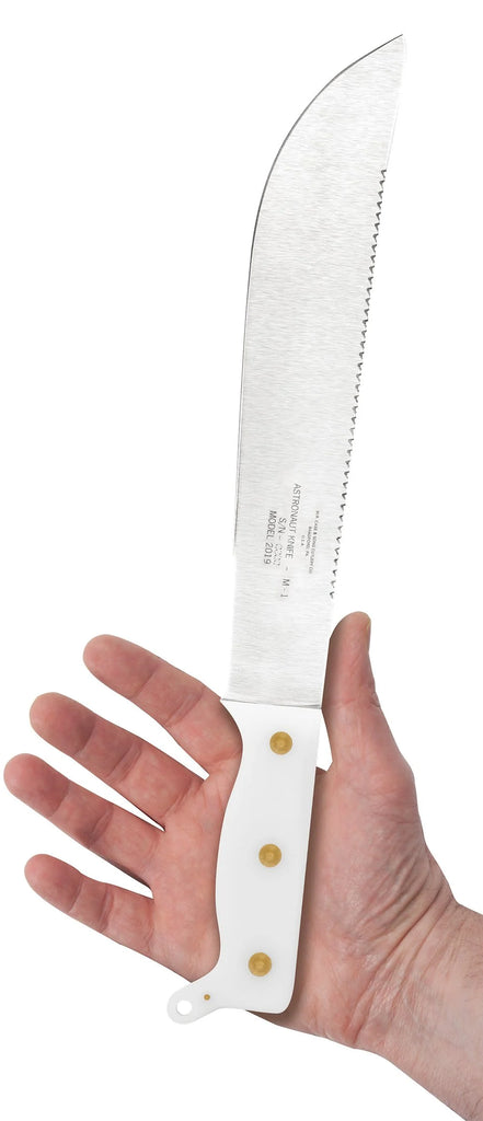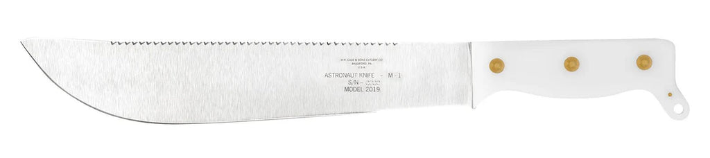 In celebration of the 50th Anniversary of man's first steps on the Moon, Case proudly presents this Case®Astronaut M-1 Knife. This re-creation pays homage to the original made for NASA's Gemini and Apollo missions program that ultimately traveled through the sea of tranquility to the Moon a total of nine times! This commemorative carries a Smooth White Synthetic handle, an Embellished As-Ground High Carbon Machete Blade, and Consecutive Serialization. Comes packaged in a two-piece presentation box. Made in Bradford, PA, USA from domestic and imported materials.